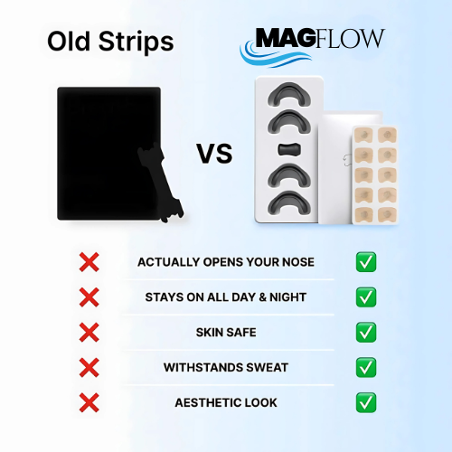 Traditional strips peel off, leave red marks, or fail on oily skin. Magflow stays put with a comfortable, hypoallergenic design that lasts all night, even if you toss, turn, or sweat. That means no more waking up congested, dry-mouthed, or tired.